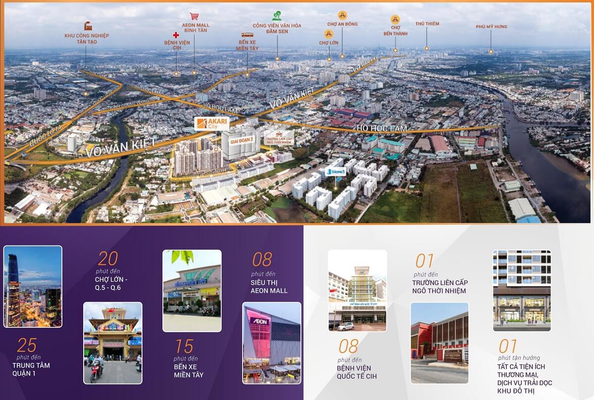 Akari City là tổ hợp căn hộ được phát triển bởi chủ đầu tư Nam Long Group, tọa lạc tại đường Võ Văn Kiệt, quận Bình Tân. Dự án có quy mô 8,5 ha được chia thành 3 giai đoạn phát triển gồm 14 tòa cao 21-29 tầng, cung cấp ra thị trường ~ 5062 căn hộ có diện tích từ 56m2 – 121m2.