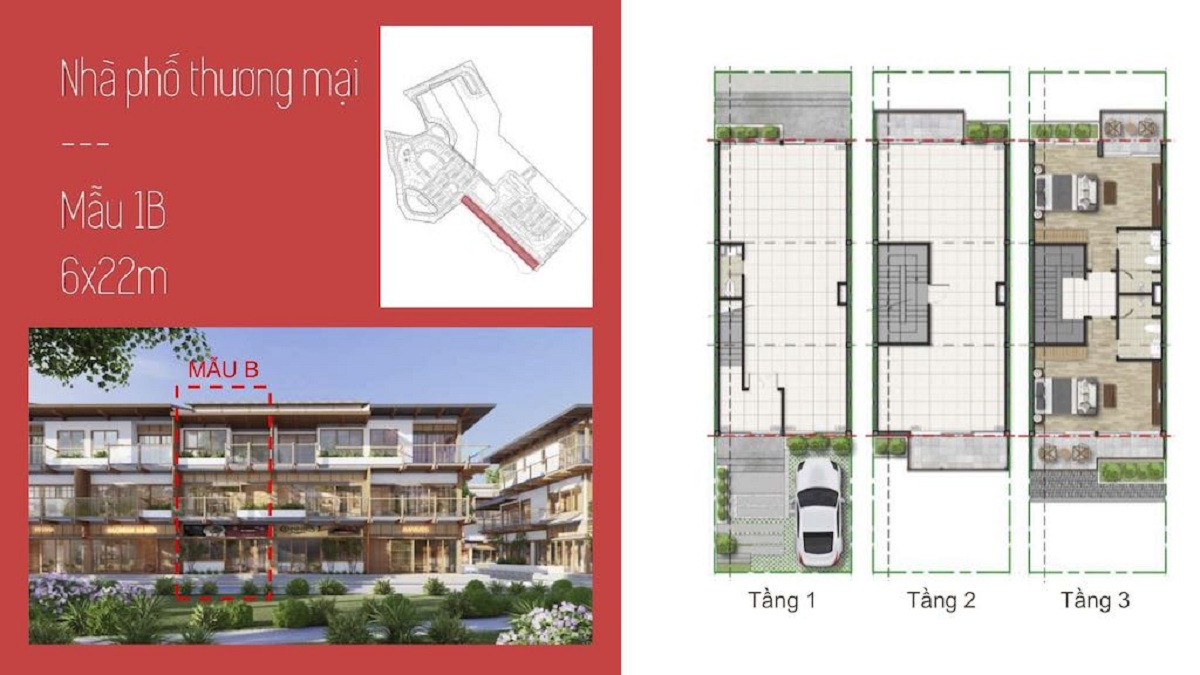 Sản phẩm Shophouse – diện tích 6x23m (1 trệt, 2 lầu) có giá bán khoảng 15,9 tỷ đồng/căn