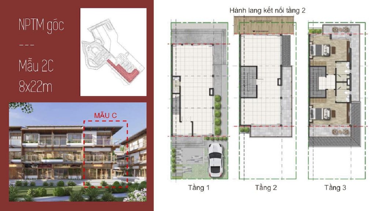 Mô hình “Triple keys” (hai tầng, ba chìa khóa), trong đó tầng một có đầy đủ các không gian chức năng của một ngôi nhà tiện nghi gồm phòng khách, một phòng ngủ, bếp và khoảng không gian sân sau hướng ra khu vườn Nhật; tầng hai bố trí hai phòng ngủ, tiếp cận bằng cầu thang với lối đi riêng.