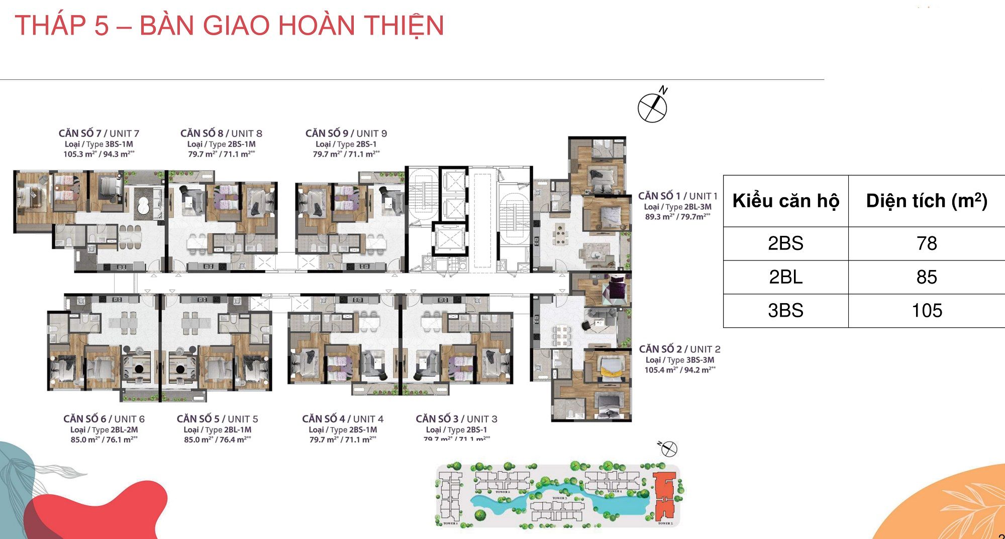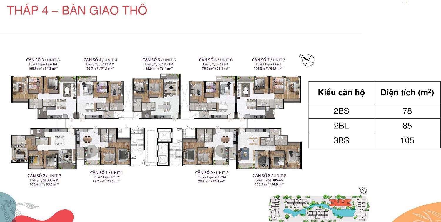 CĂN HỘ: Căn hộ 1 phòng ngủ: 50m2; Căn hộ 2 phòng ngủ; 78m2 – 91m2; Căn hộ 3 phòng ngủ: 105m2