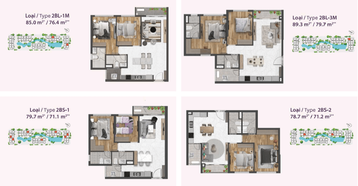 Các căn 2 phòng ngủ có diện tích 71m2 – 76m2 – 79m2