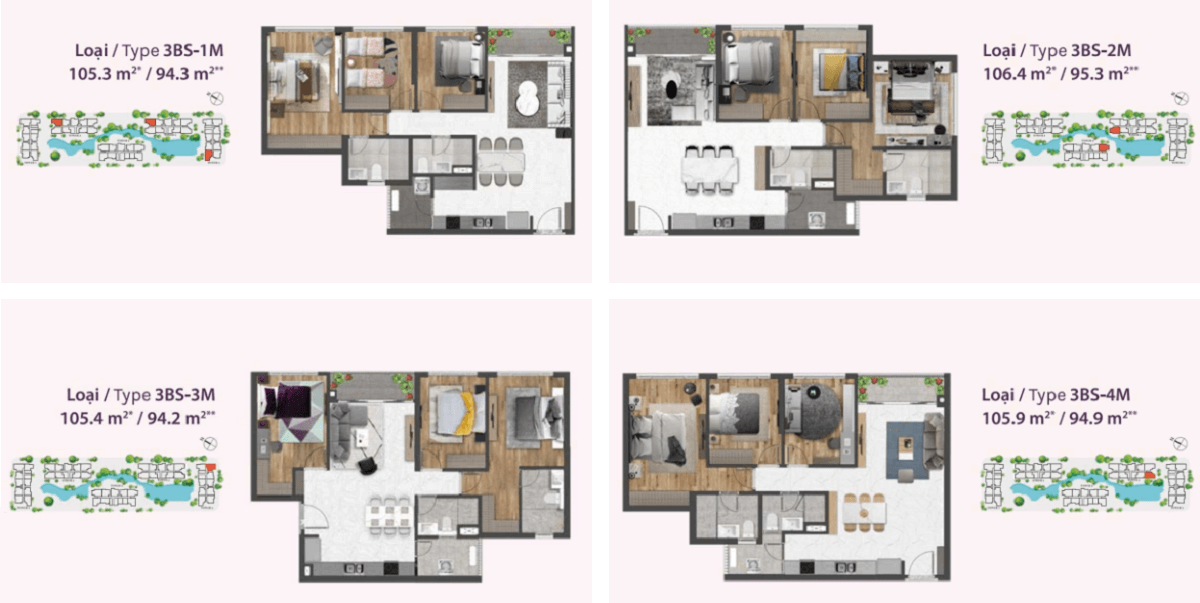 Các căn 3 phòng ngủ có diện tích 94m2 & 95m2