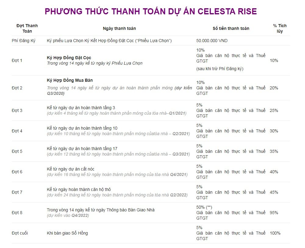 GIÁ BÁN CĂN HỘ & TIẾN ĐỘ THANH TOÁN CELESTA RISE