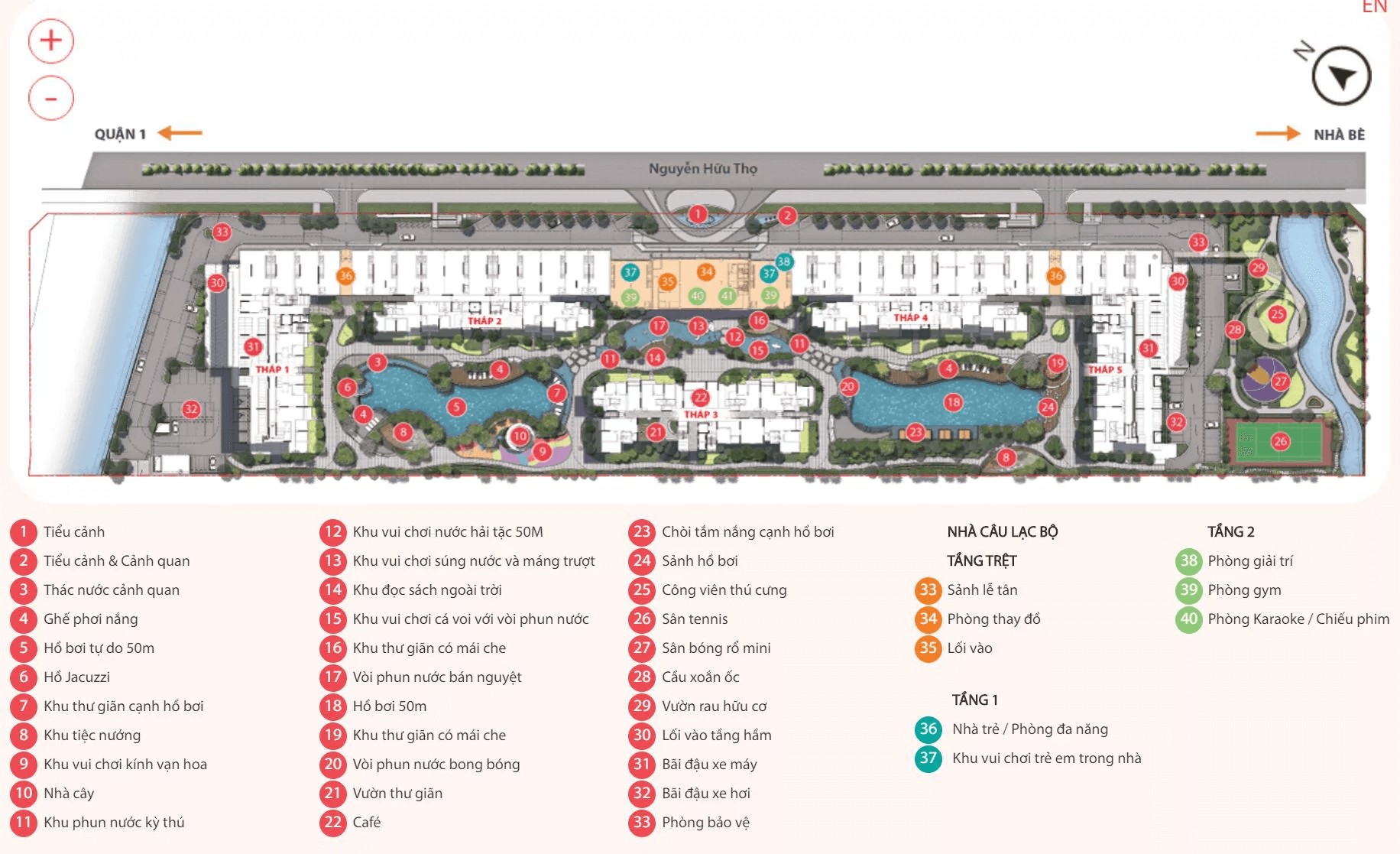 3 Hồ bơi: hồ bơi thư giản phong cách resort; hồ bơi chuẩn Olympic 50m; khu vui chơi nước cho trẻ em