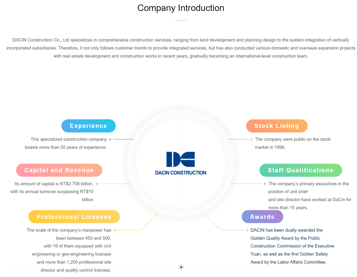 Dacin Construction là doanh nghiệp xây dựng có lịch sử hoạt động gần 50 năm, đồng thời là công ty cổ phần niêm yết với quy mô lớn và phạm vi hoạt động quốc tế. Tập đoàn này được đánh giá nằm trong Top 3 thương hiệu xây dựng hàng đầu tại Đài Loan, đồng thời giữ vị thế vững chắc tại nhiều thị trường châu Á nhờ năng lực thi công, quản lý dự án và kiểm soát chất lượng theo tiêu chuẩn cao.