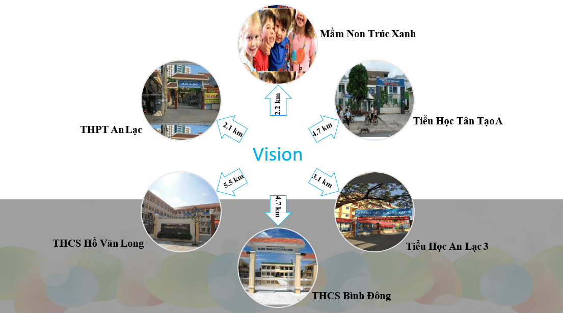 Vision Bình Tân cũng chú trọng đến yếu tố giáo dục khi bố trí trường mầm non ngay trong nội khu. Đây là tiện ích mang tính thực tế cao, giúp các gia đình trẻ tiết kiệm thời gian đưa đón con, đồng thời đảm bảo môi trường học tập gần nhà, thuận tiện cho sinh hoạt hằng ngày. Việc tích hợp trường mầm non nội khu là xu hướng phổ biến tại các khu đô thị hiện đại, hướng đến xây dựng cộng đồng cư dân ổn định và lâu dài.