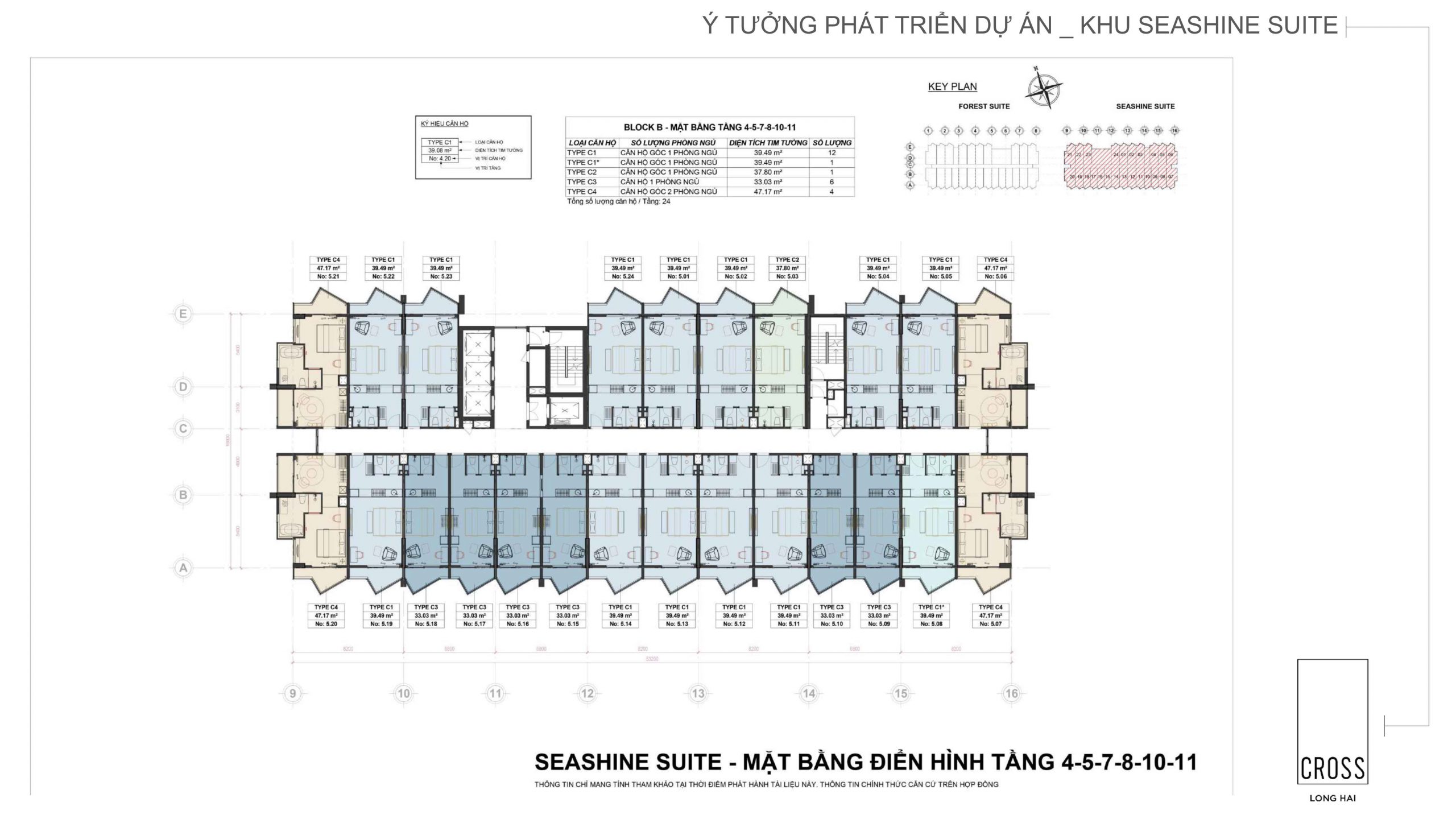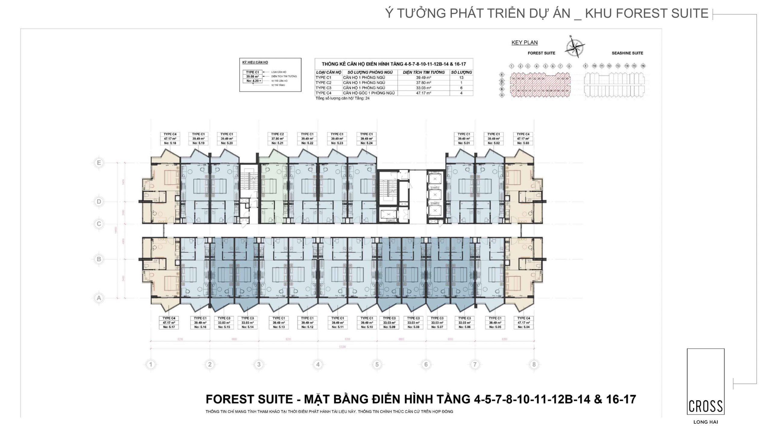 The Forest SuitesThe Seashine Suites, cung ứng ra thị trường 658 căn hộ với mỗi căn có diện tích từ 31 m2 – 85 m2 . Các căn hộ Cross Long Hải có phong cách thiết kế nhiều loại hình từ 1 phòng ngủ, 2 phòng ngủ đến duplex.