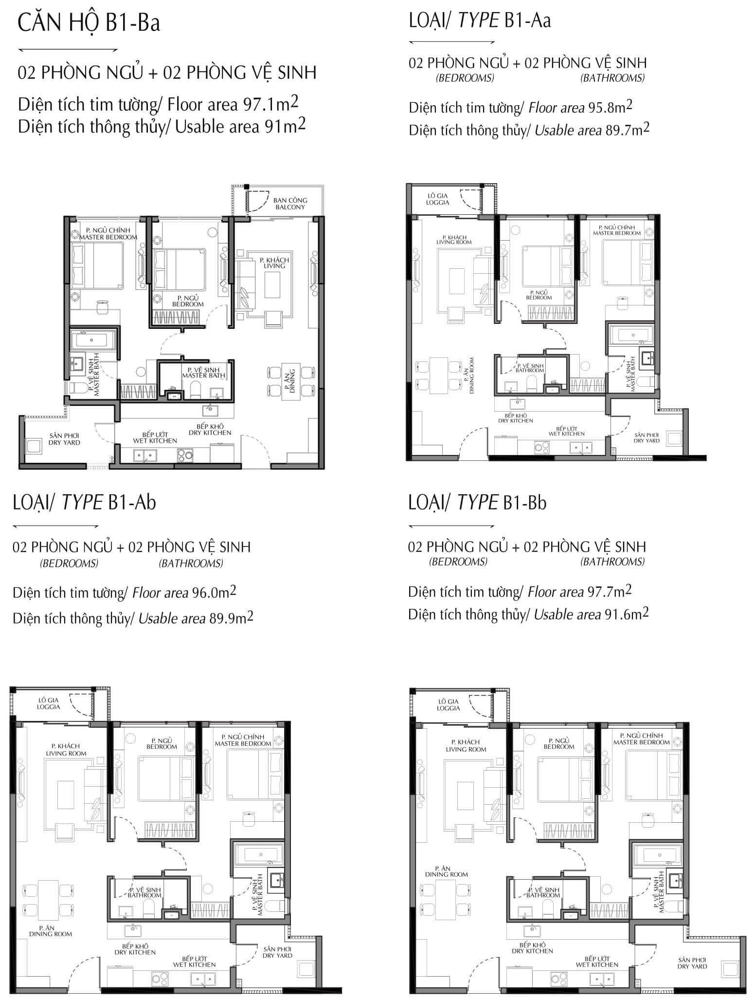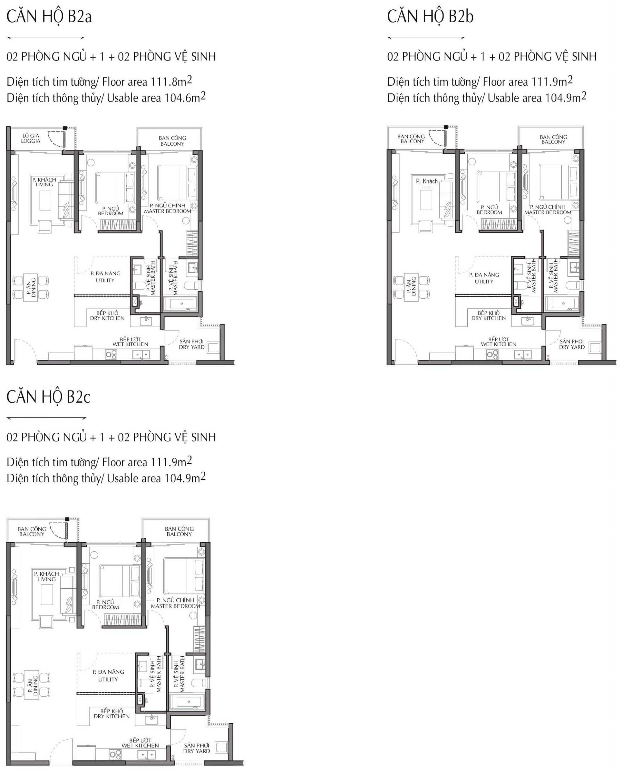 Căn 2 phòng ngủ : 90m2 – 131m2