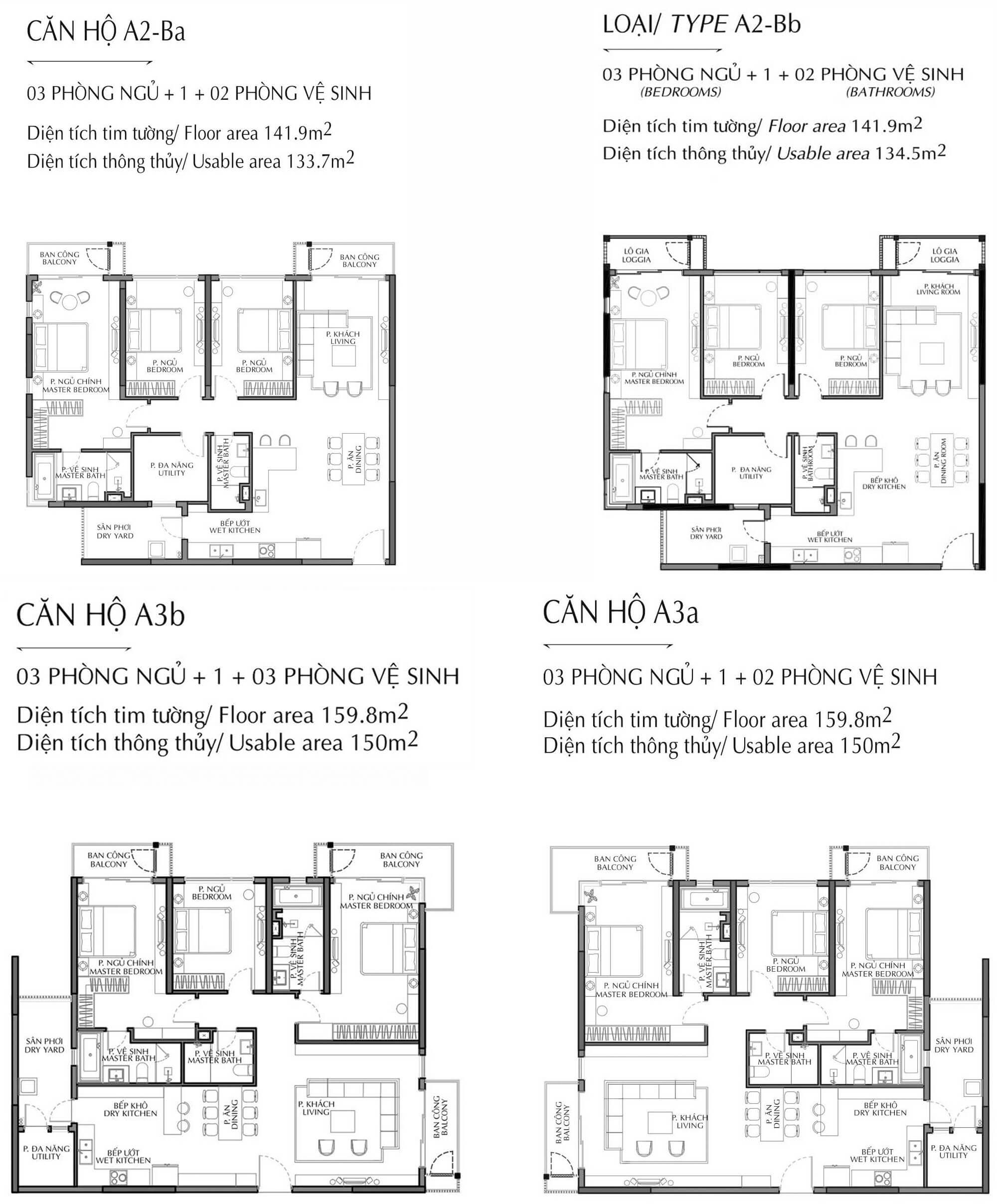 Căn 3 phòng ngủ : 120m2 – 160m2