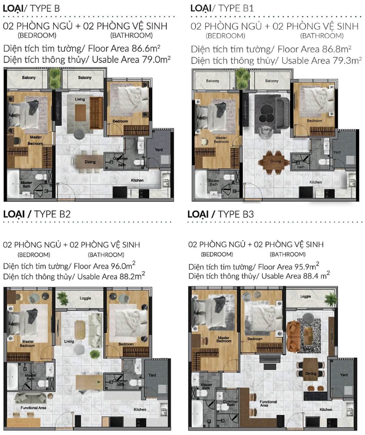 Căn 2 phòng ngủ diện tích 86m2 – 96m2
