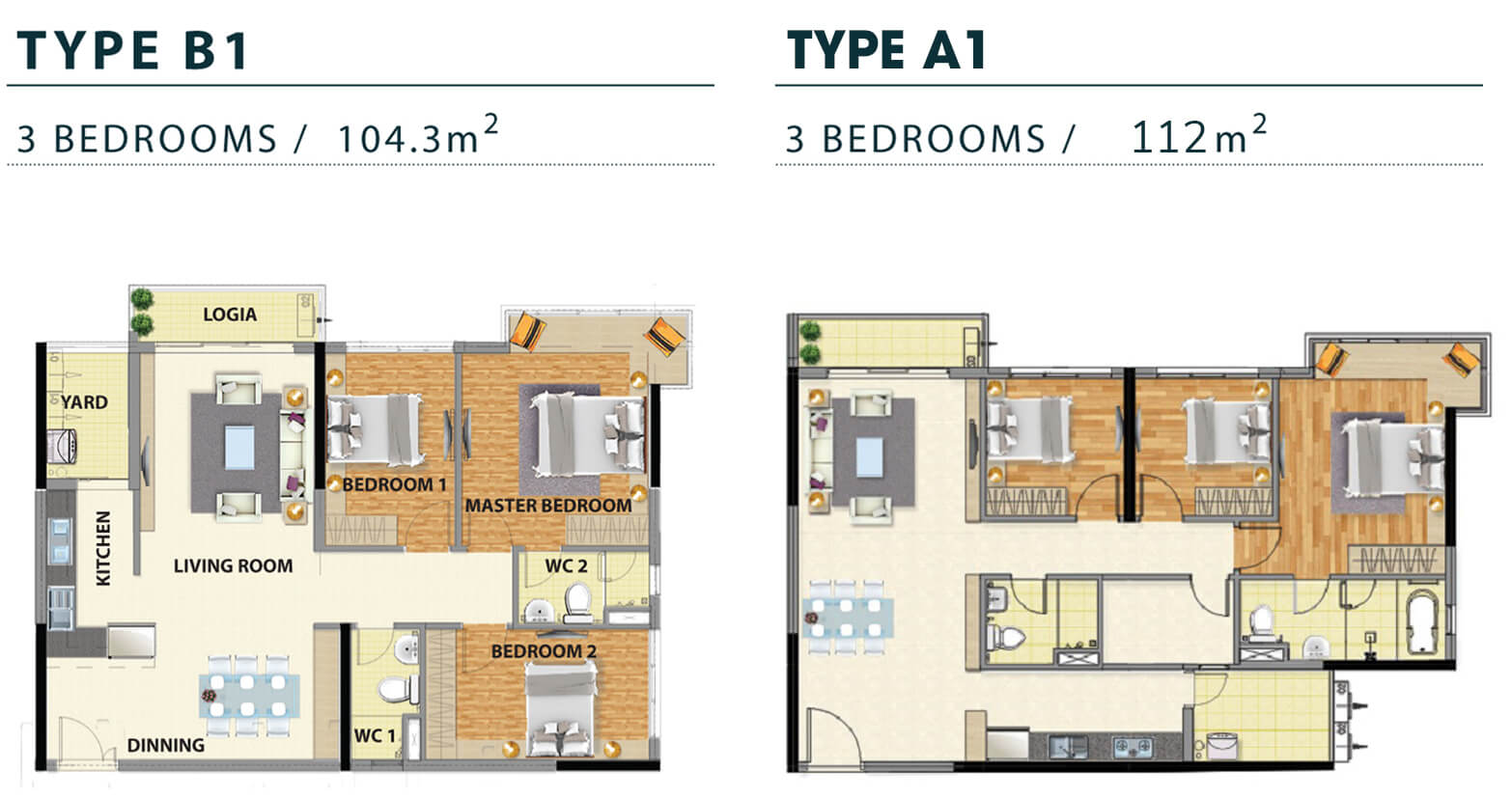 Căn 3 phòng ngủ: 104m2 – 112m2