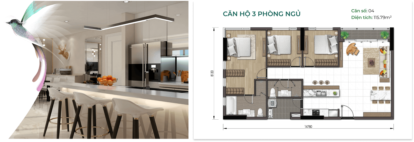 Thiết kế căn 3 phòng ngủ 115m2