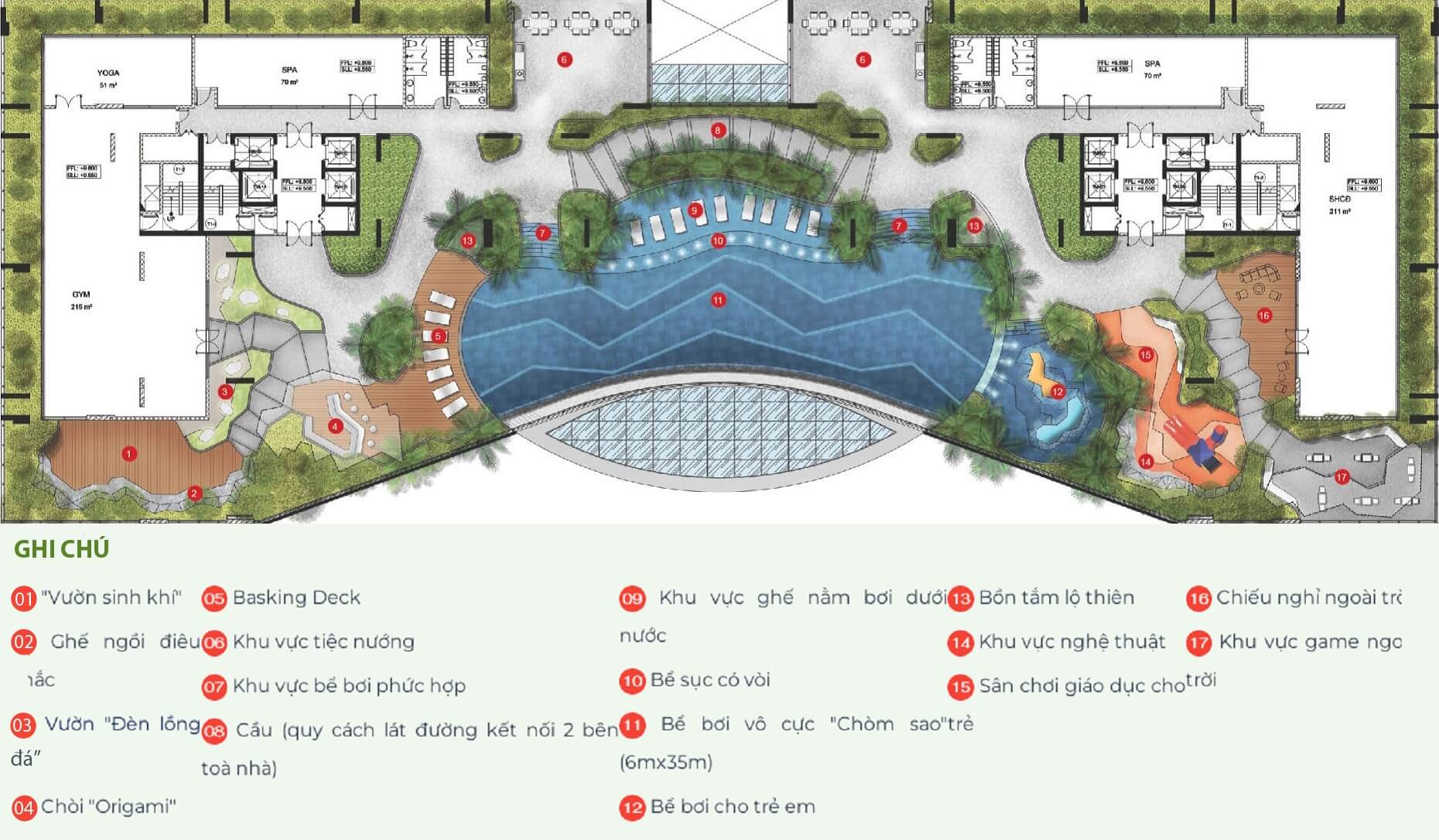Khu hồ bơi tràn với các chức năng: hồ Jacuzzi; hồ relaxation pool, lap pool theo phong cách Nhật Bản