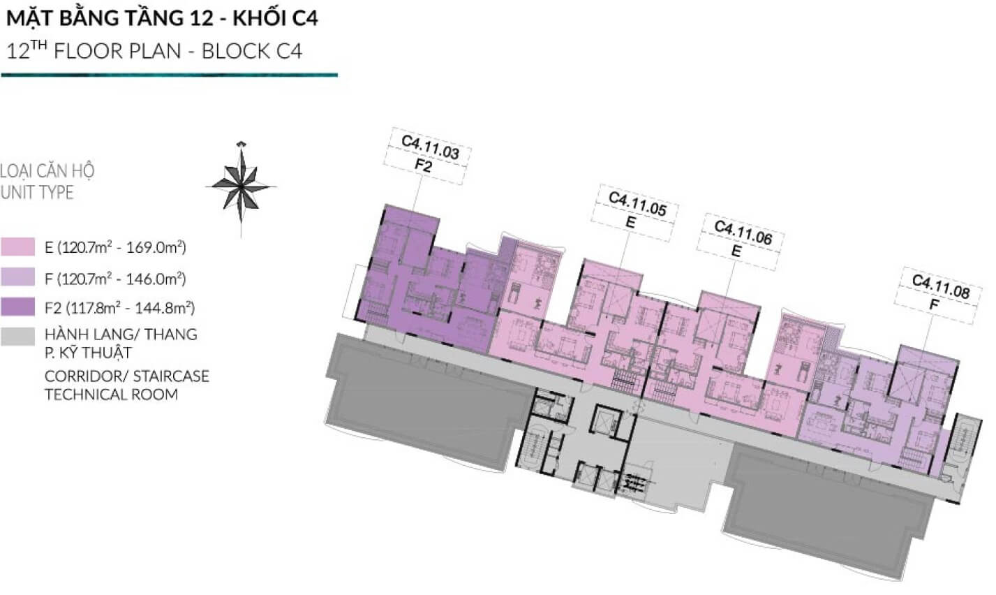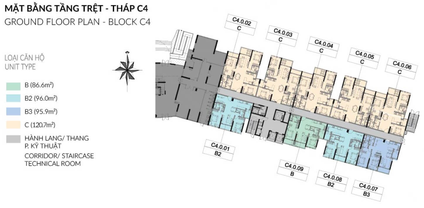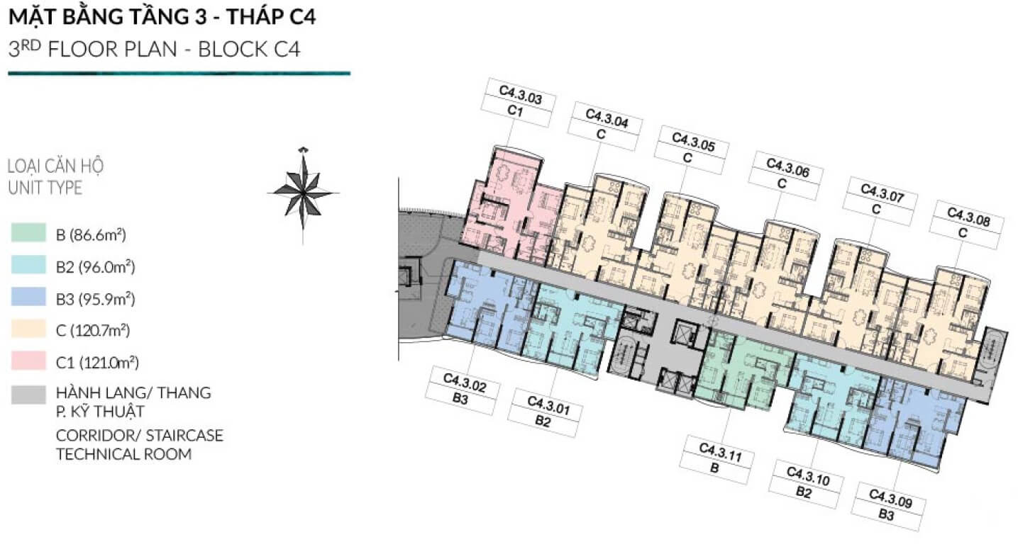 Block C4 gồm 1 tòa tháp cao 13 tầng. Thiết kế 11 căn/sàn/3 thang máy