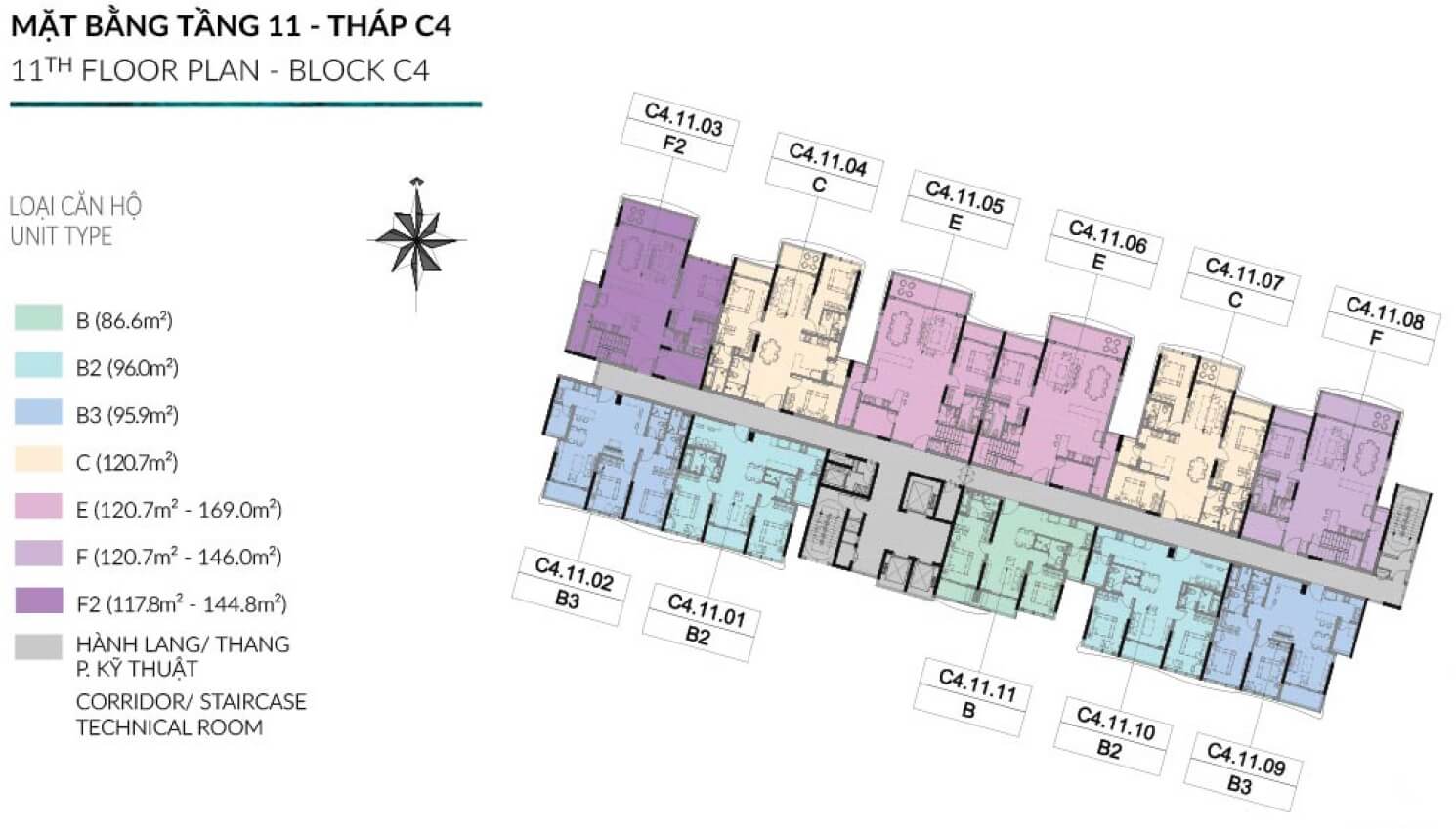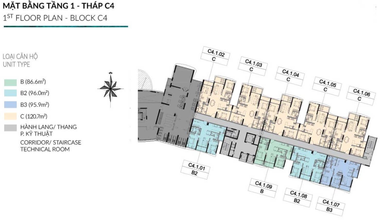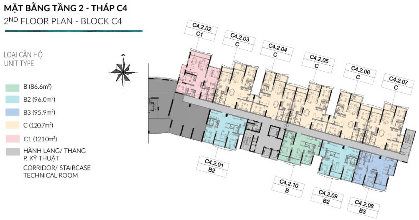 Block C4 gồm 1 tòa tháp cao 13 tầng. Thiết kế 11 căn/sàn/3 thang máy