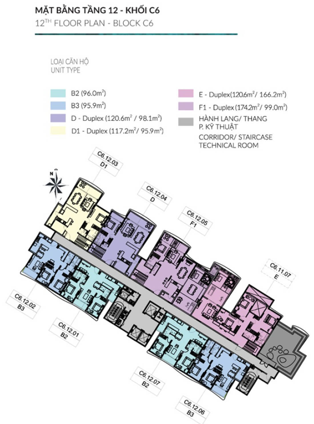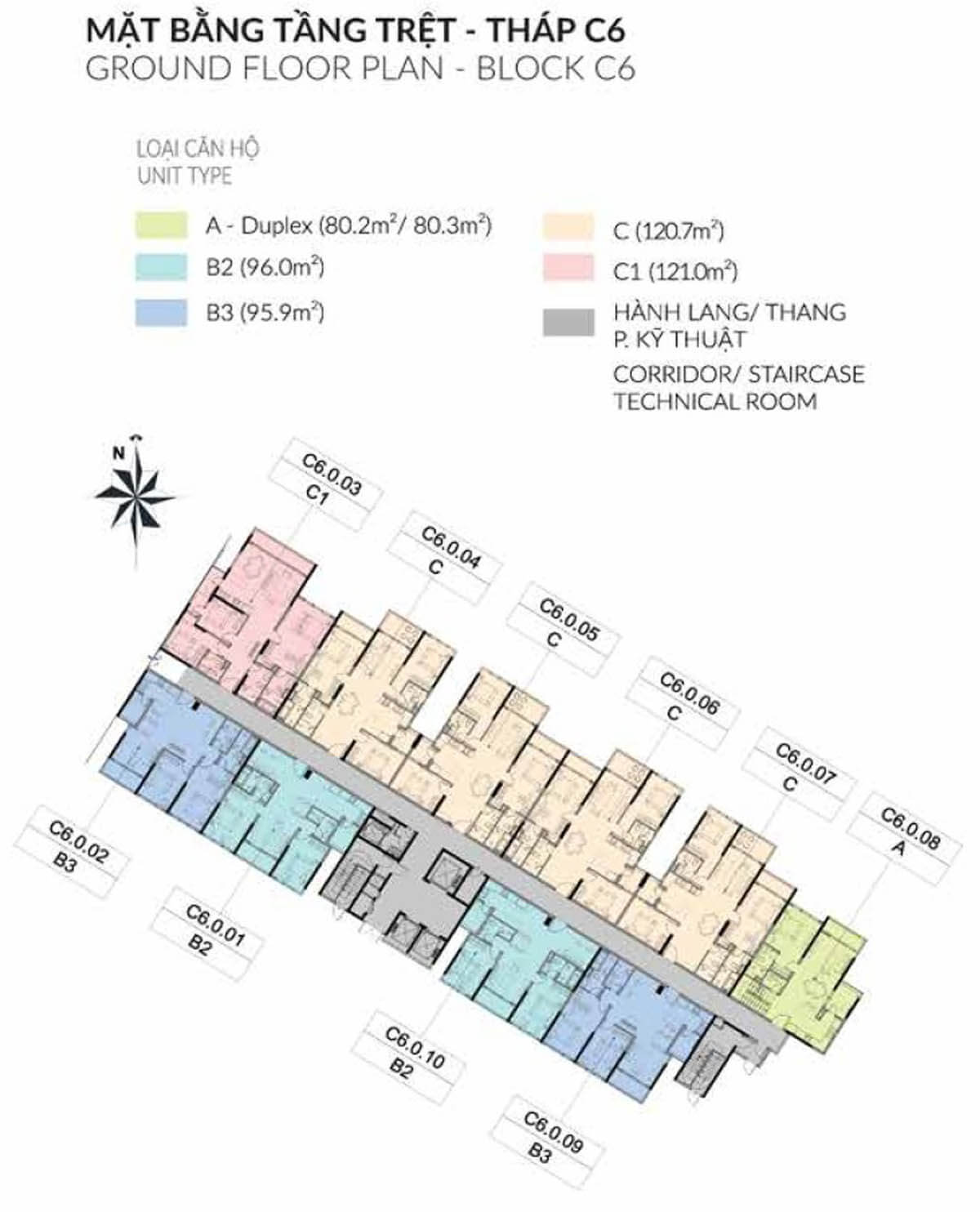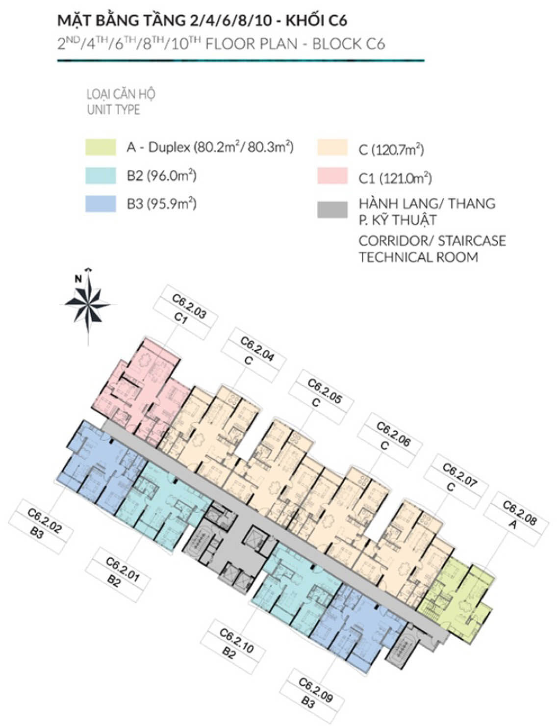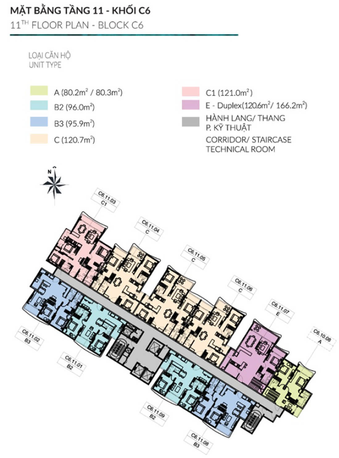 Block C6 gồm 1 tòa tháp cao 13 tầng. Thiết kế 11 căn/sàn/3 thang máy