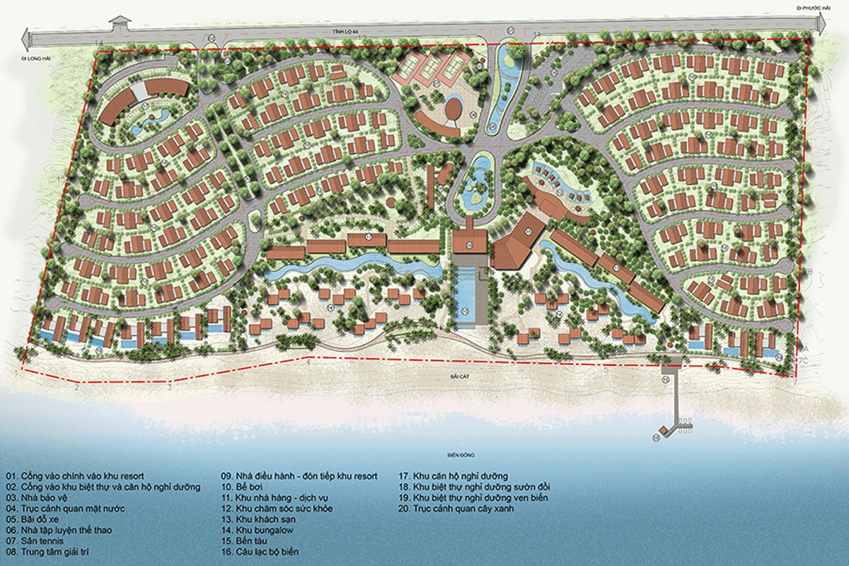 Mặt bằng Oceanami Hồ Tràm được quy hoạch trên khu đất có diện tích 22ha, gồm 347 căn biệt thự có diện tích từ 200m2 – 600m2 ( thiết kế 2 – 6 phòng ngủ ).