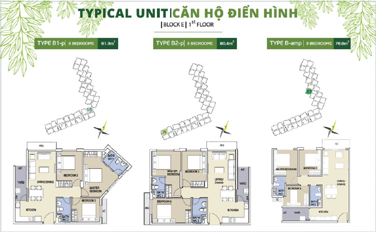 Căn hộ 3 phòng ngủ diện tích: 78m2 – 98m2