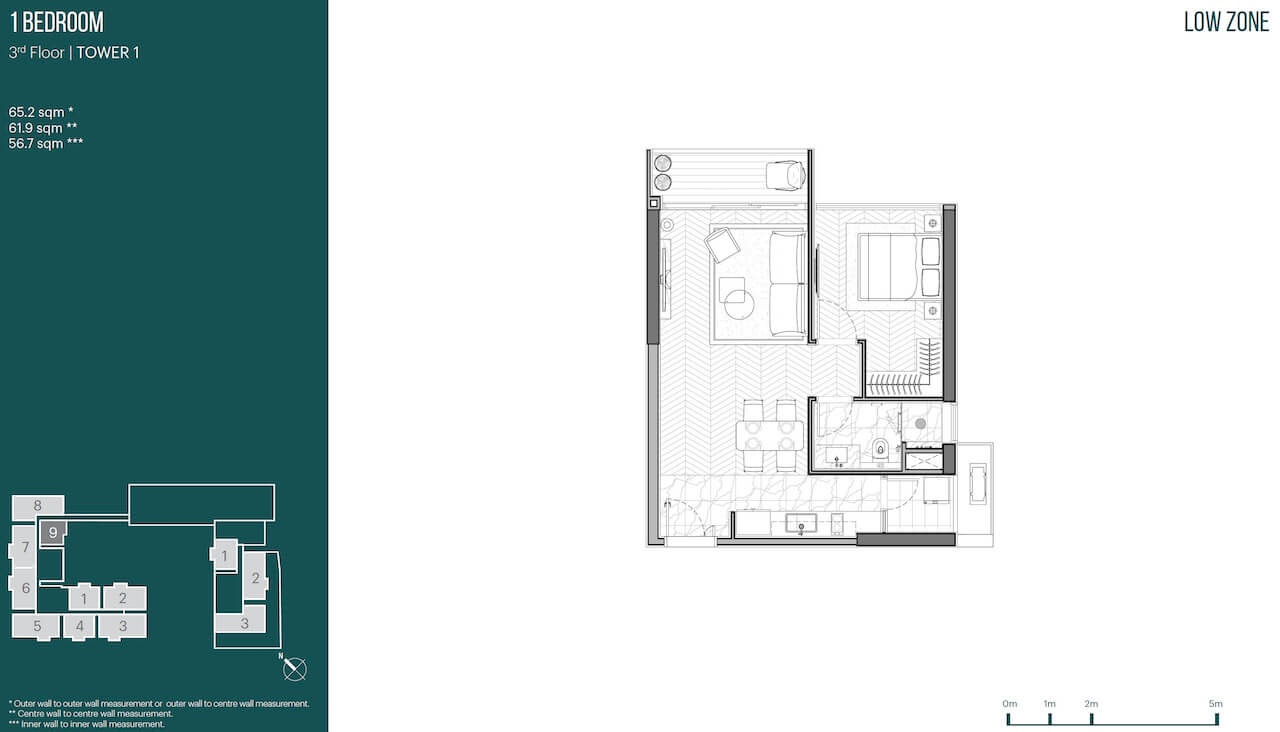 Căn hộ 1 phòng ngủ: 62–65m² – Căn hộ 2 phòng ngủ: 92–94m²