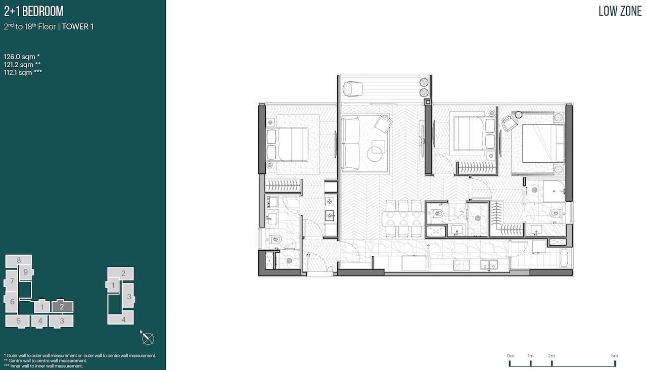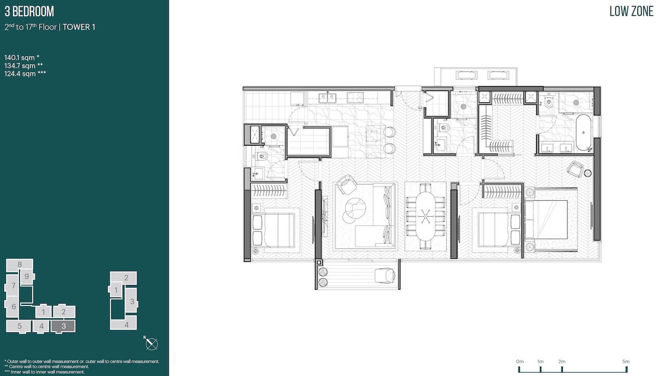 Căn hộ 2 phòng ngủ + 1 Dual Key: 126–128m² – Căn hộ 3 phòng ngủ: 135–147m²
