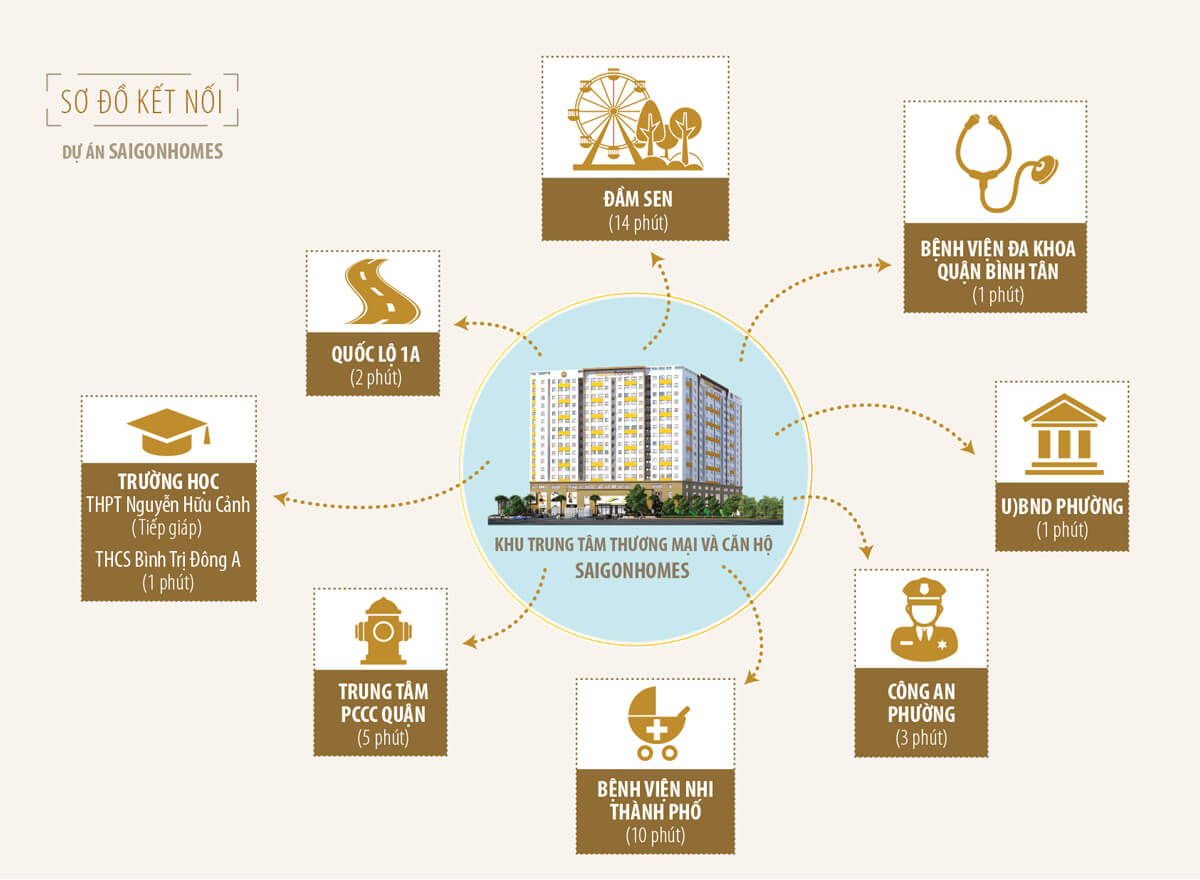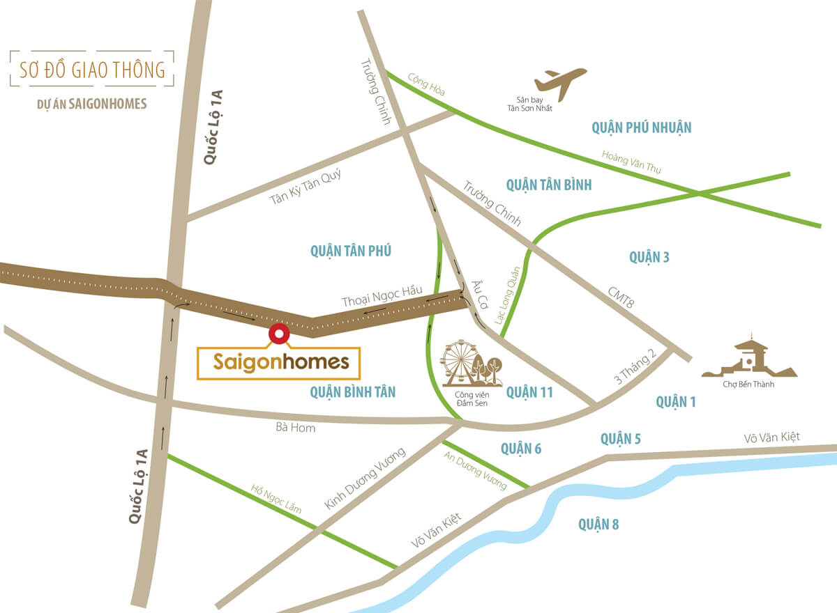 Căn hộ quận Bình Tân SaigonHomes tọa lạc tại 819 Hương Lộ 2, Phường Bình Trị Đông A, Quận Bình Tân, Thành phố Hồ Chí Minh. Từ đây cư dân dễ dàng kết nối thuận tiện đến các tiện ích trong khu vực thông qua các tuyến giao thông huyết mạch như: Quốc lộ 1A, Âu Cơ, Trường Chinh, đường 3/2…