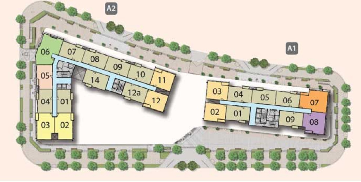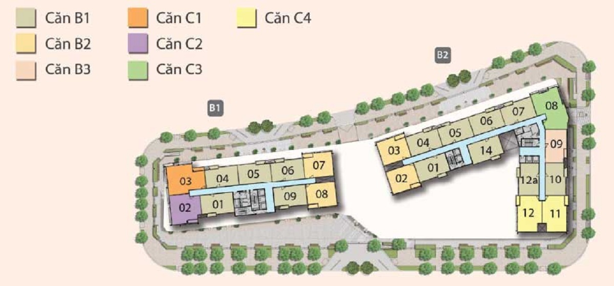 4 tòa tháp cao 12 tầng & 2 tầng hầm, ký hiệu A1, A2 – B1, B2
