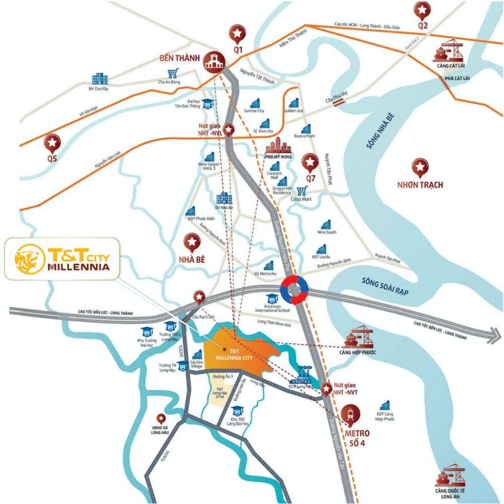 T&T City Millennia là khu đô thị sinh thái tọa lạc tại cửa ngõ Tây Nam Sài Gòn, cạnh KCN Long Hậu ( ~ 500ha ) và khu đô thị cảng Hiệp Phước ( 3900ha ) sẽ mang đến môi trường sống chất lượng và tiềm năng tăng giá lớn cho các nhà đầu tư.