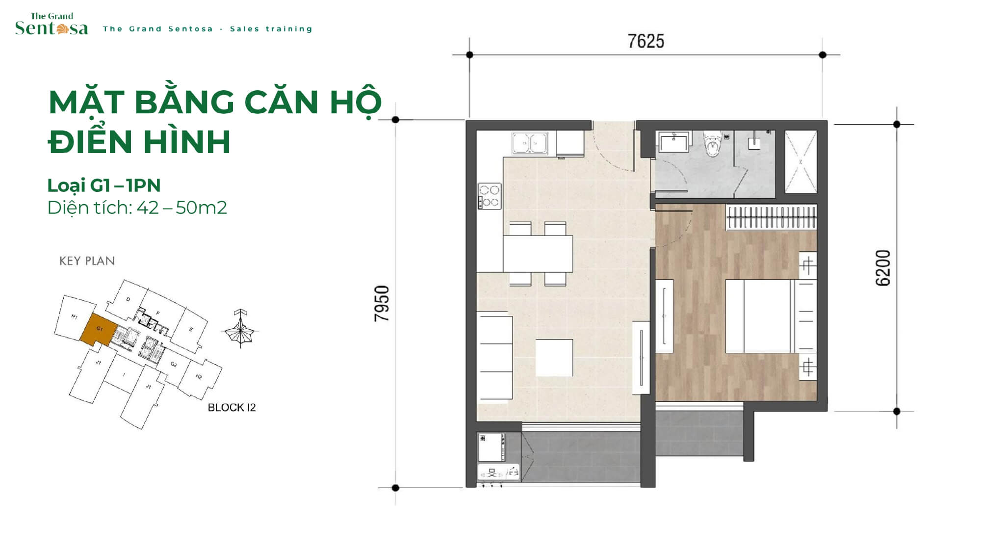 Các căn 1 phòng ngủ có diện tích từ 42m2 – 50m2