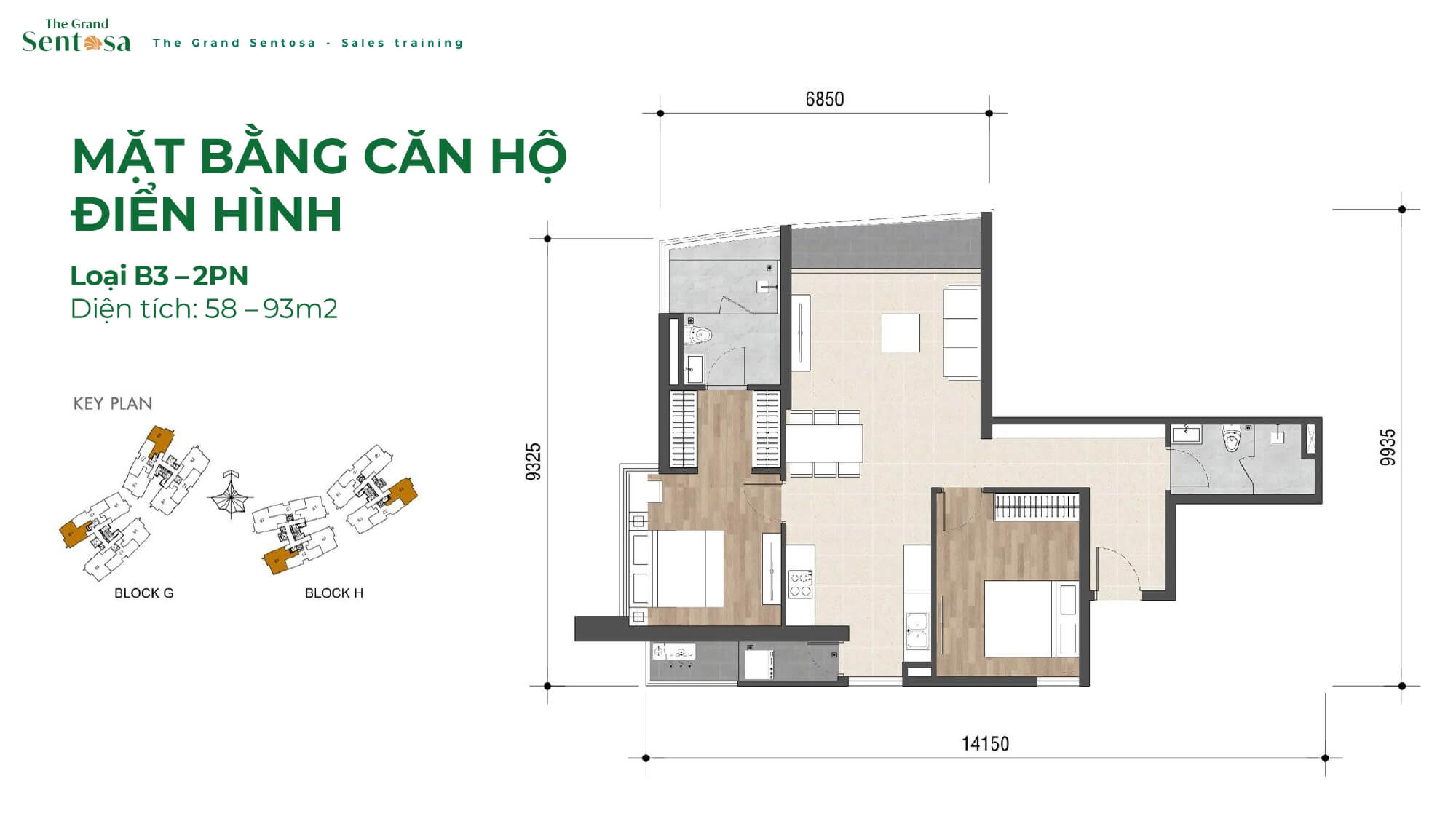 Các căn 2 phòng ngủ có diện tích từ 58m2 – 93m2