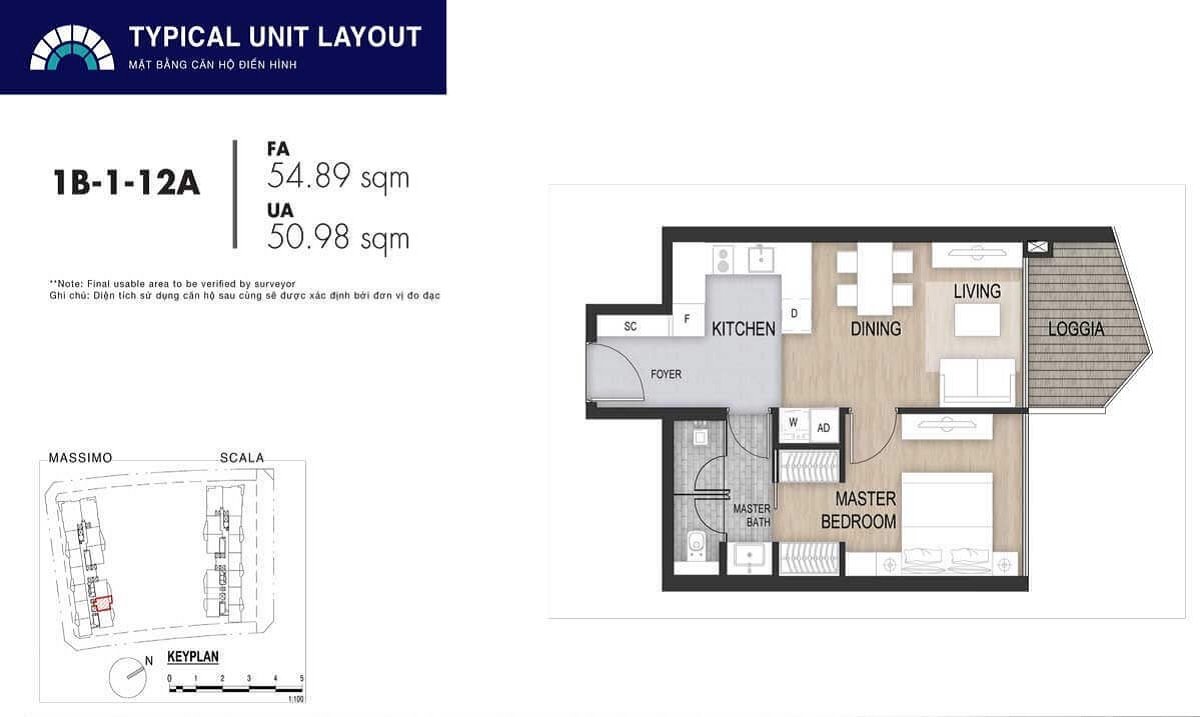 Diện tích căn 1 PN: 55 m2