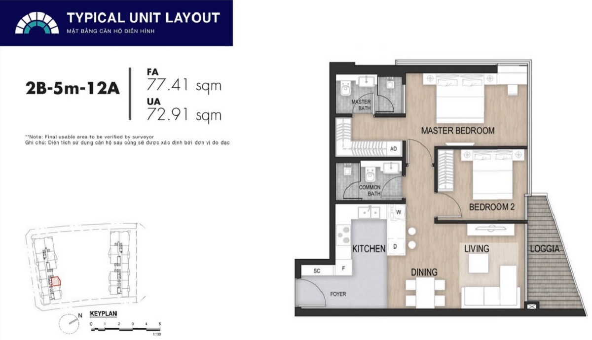 Diện tích căn 2 PN: 80 m2