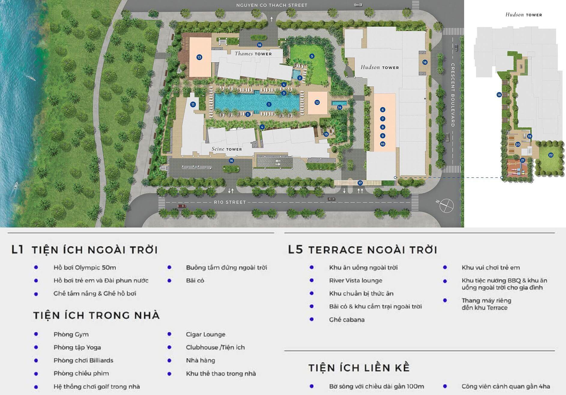 Cùng với các đối tác danh tiếng thế giới, The River Thủ Thiêm gồm 3 tòa tháp mang tên 3 dòng sông vĩ đại nhất trên thế giới – Seine Tower, Thames Tower và Hudson Tower, với 525 căn hộ hạng sang, tọa lạc tại đại lộ Vòng Cung – đại lộ biểu tượng mới của thành phố Hồ Chí Minh.