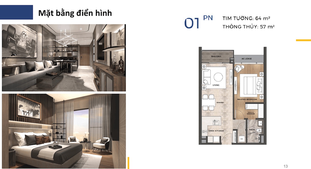 1 phòng ngủ: 57m2 – 2 phòng ngủ: 77m2-82m2