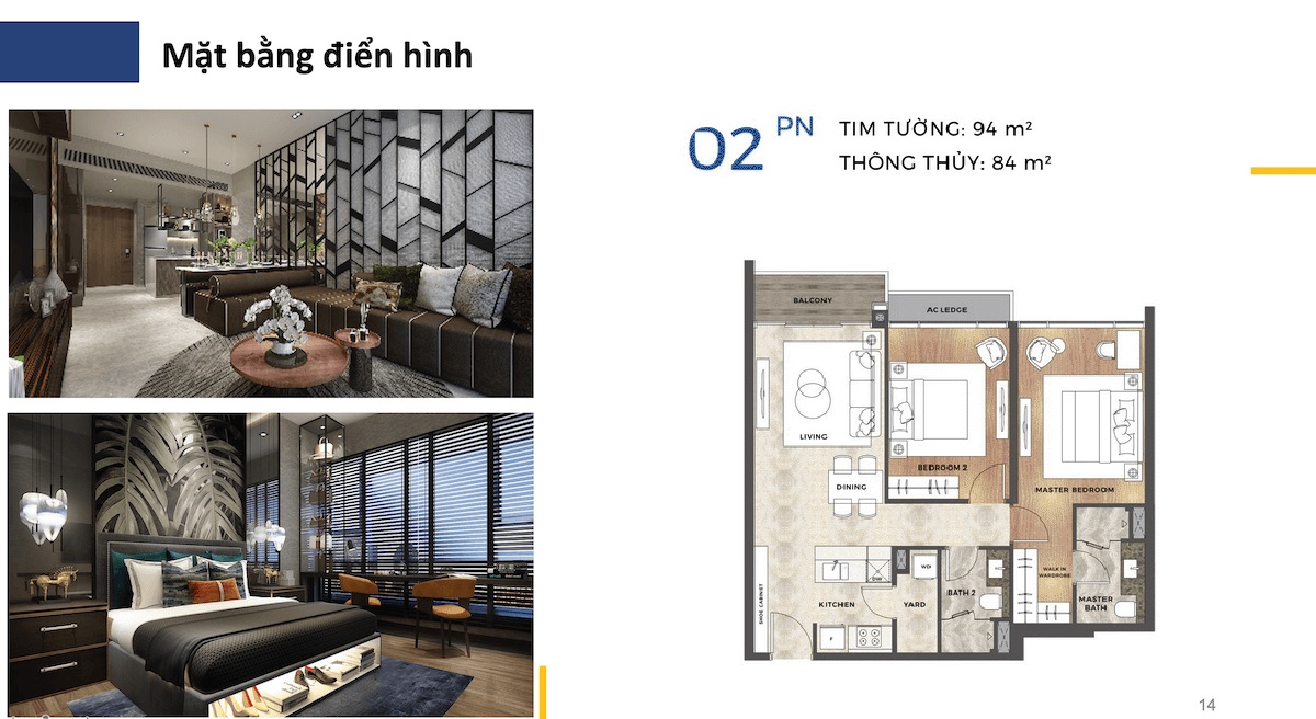 Giá căn hộ loại 2 phòng ngủ (94m2): 12 tỷ – 13 tỷ