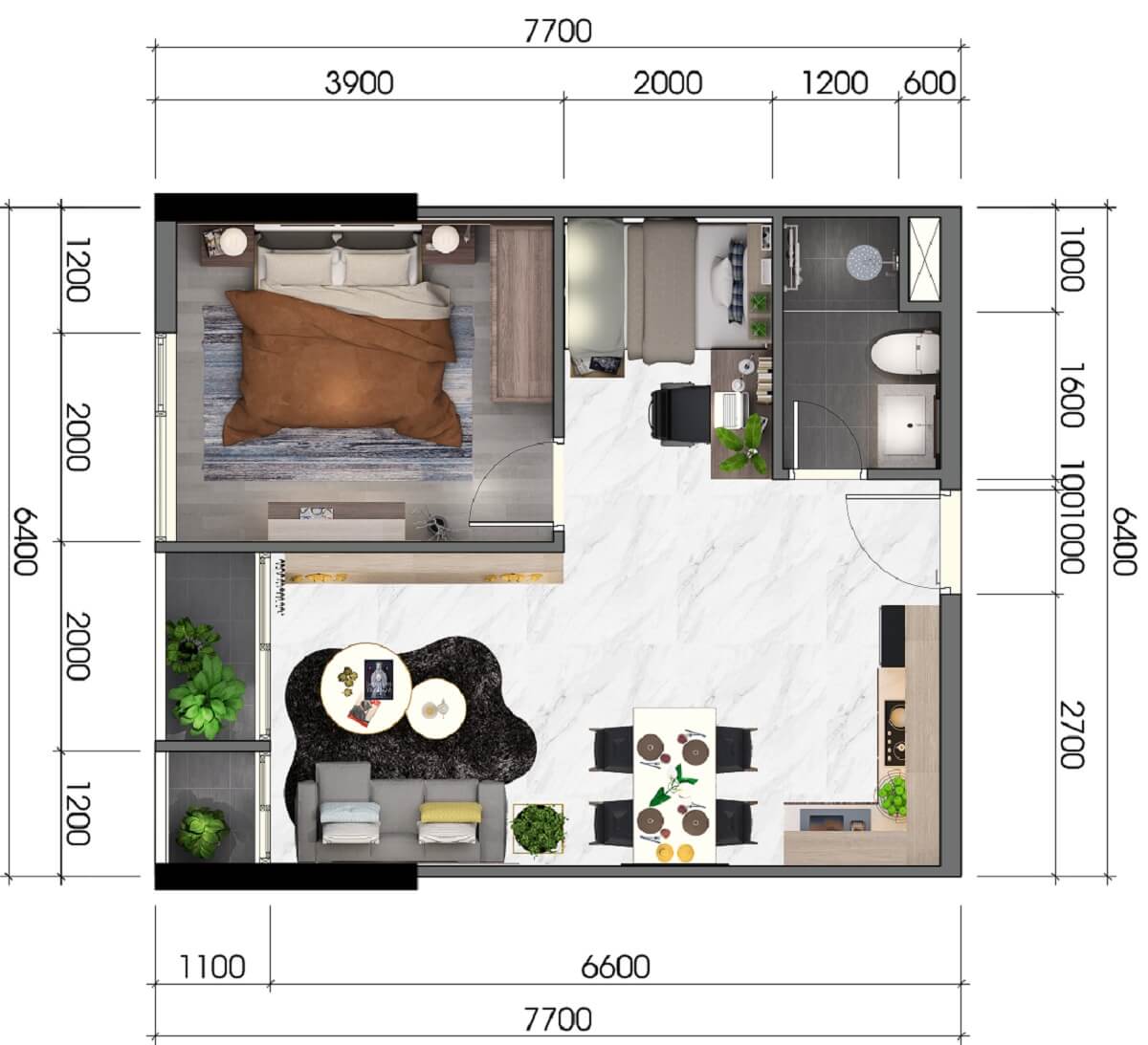 Thiết kế chi tiết căn hộ 1 phòng ngủ