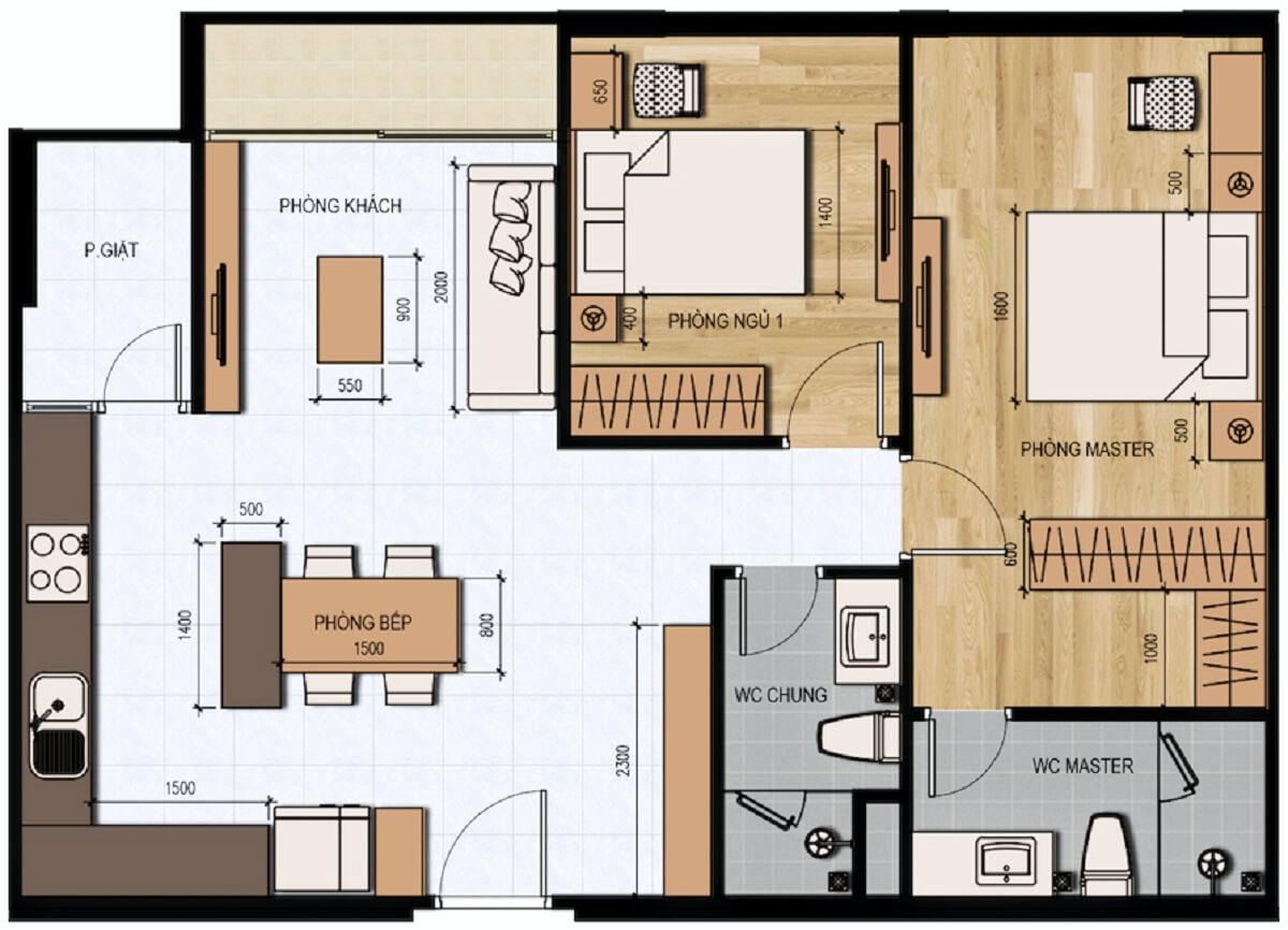 Căn 2 phòng ngủ: 79.6 – 81.5 m2