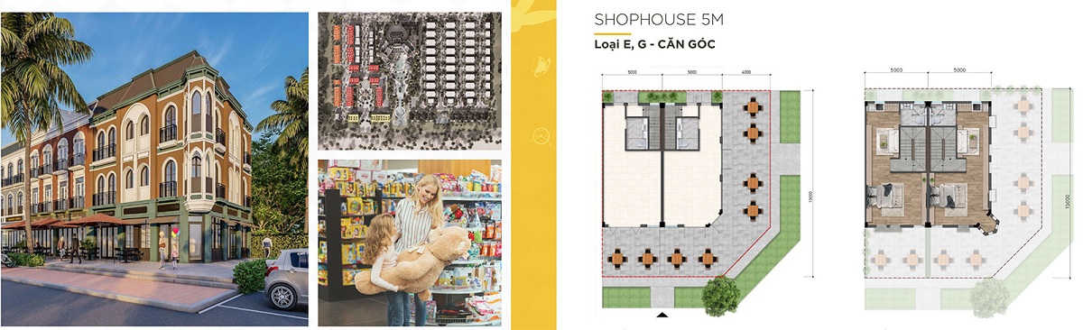 Khu shophouse: có lối thiết kế ấn tượng, đa dạng loại hình, đồng thời được quy hoạch bố trí hợp lý để biến nơi đây thành trung tâm mua sắm; vui chơi – giải trí – ẩm thực của cả vùng.